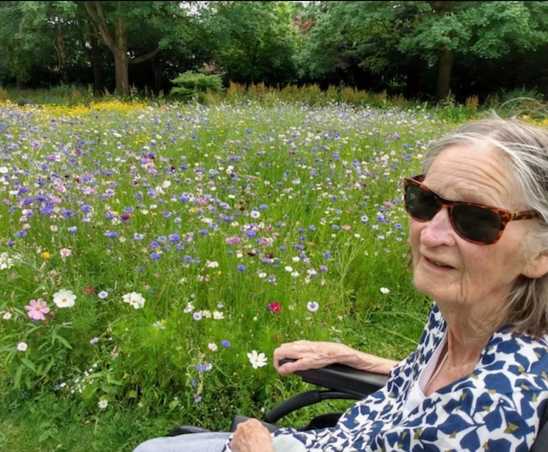 Nora next to wildflower bed area that has now been replanted and renamed after her.