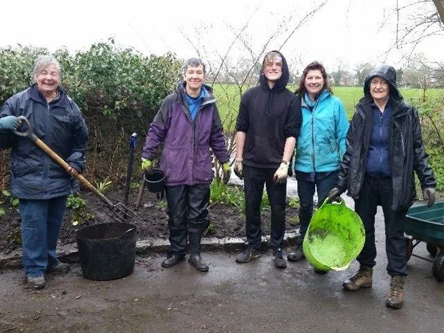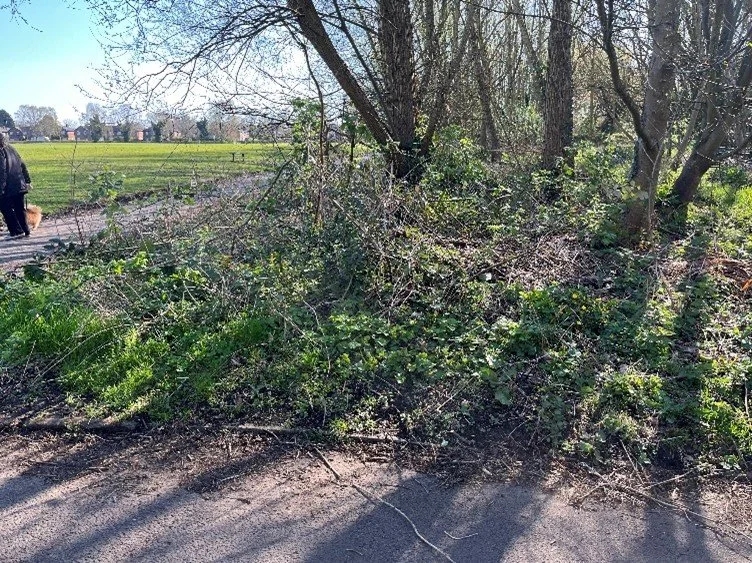 In 2025 Gardening Group member Sue had the idea of creating a woodland transition area between managed raised beds near the ponds and the adjacent natural woodland area. The project involved the removal of grass, fallen branches, nettle and brambles and translocation of naturally occurring floral woodland species from the adjacent wooded area including cow parsley, red campion and lesser celandine.