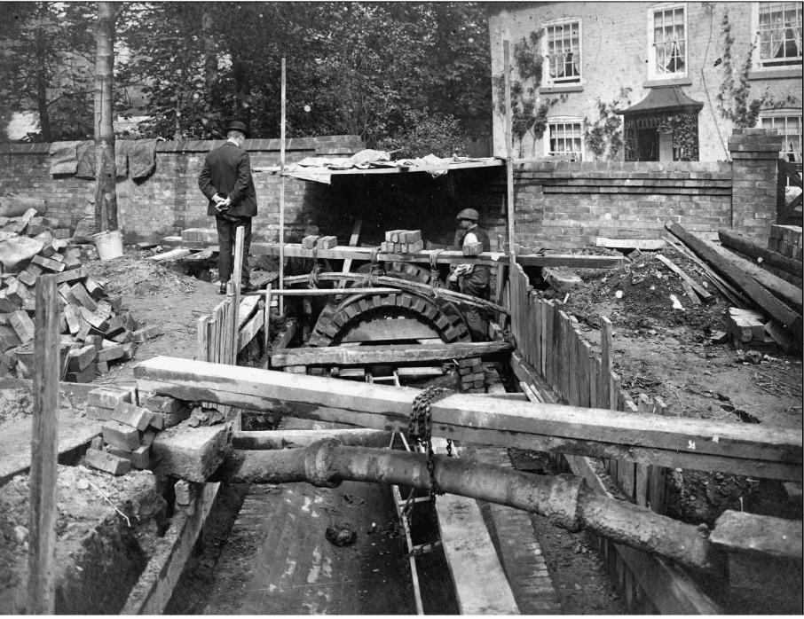 These culverts were beautifully made, as can be seen in this photograph below from 1914 which shows the rebuilding of the culvert as it crosses Fog Lane. In the background is the old Toll House, which is still there today.