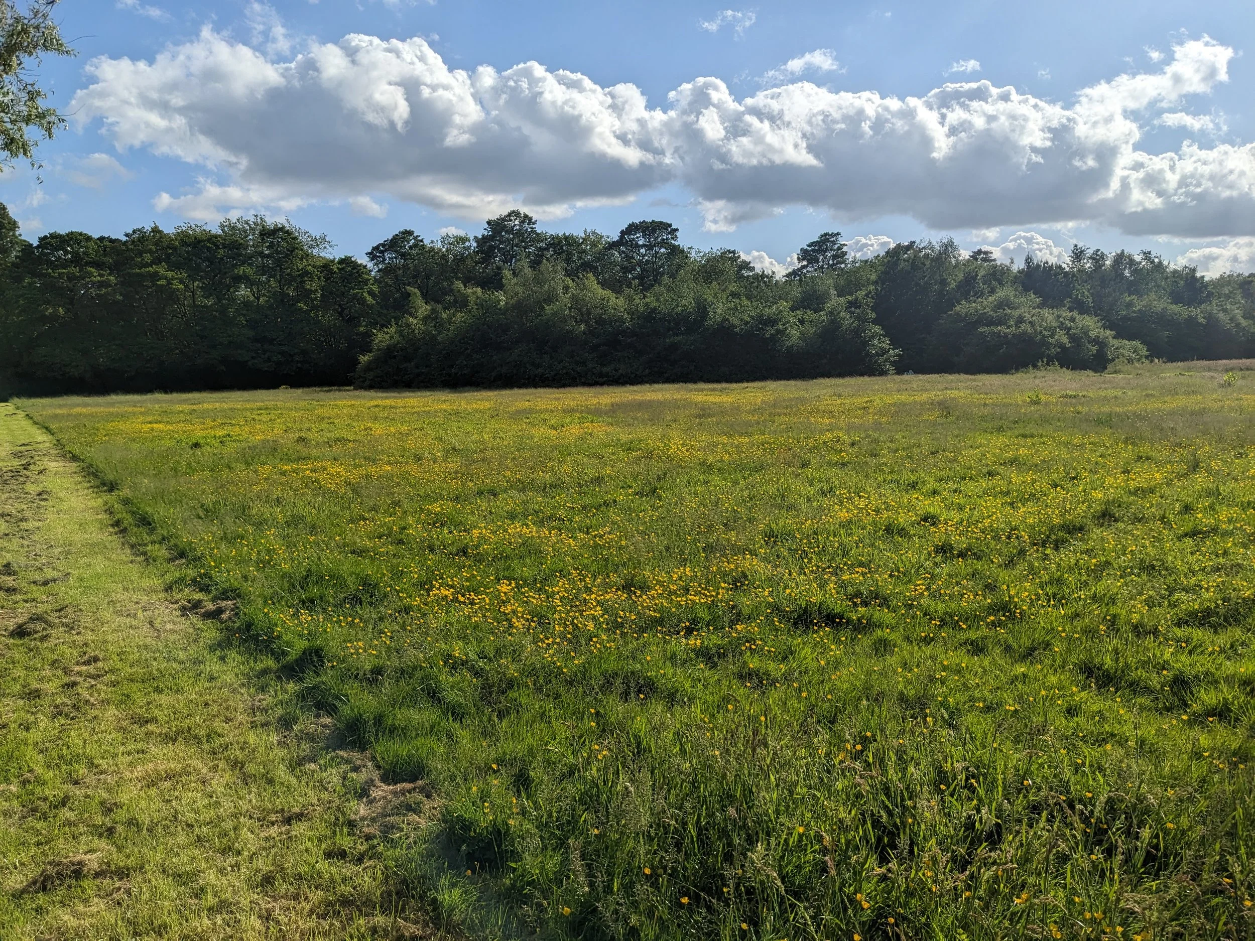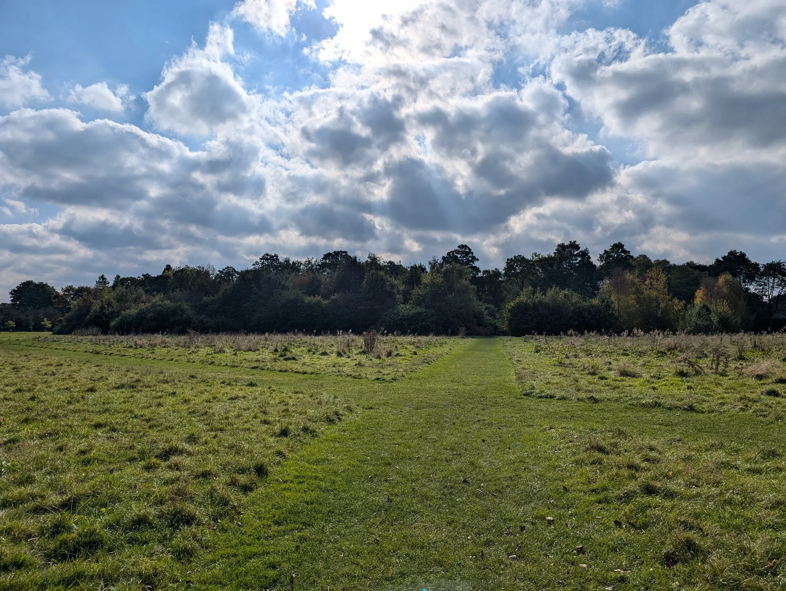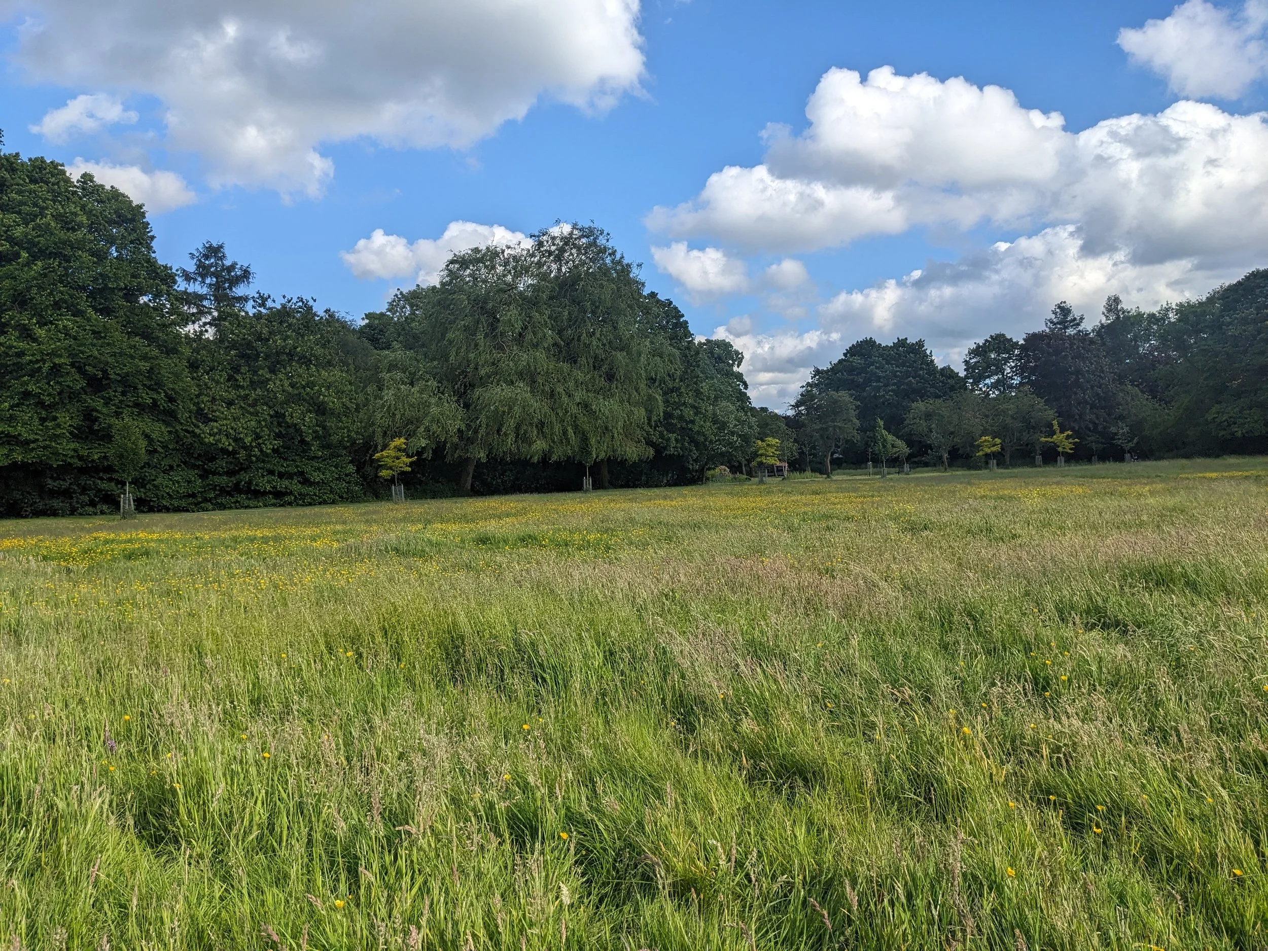 The meadow is a blend of wild grassland, wild flowers, saplings, and the copse that is locally known as 'Tiger Wood’. It is an ideal area for getting closer to nature, connecting with the environment, dog-walkers, and relaxing in general. You can still find Yorkshire Fog grass growing in the meadow. Fog Lane, and hence Fog Lane Park, are named after Yorkshire Fog (Holcus lanatus).