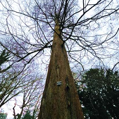 The group of coast redwoods near the Old Broadway entrance provide a splash of colour even in winter - the species name "sempervirens" means "evergreen". They are related to giant redwoods and can grow to 110m tall in their native NW America, but fortunately for us only grow to around 40m in the UK. Look out for their elegant conical shape, soft red bark and small cones.
