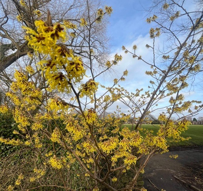 Our witch hazel tree is small but beautifully formed. Located by the raised beds near the pond, the yellow winter flowers are stunning to look at close up with their unusual spidery shape.